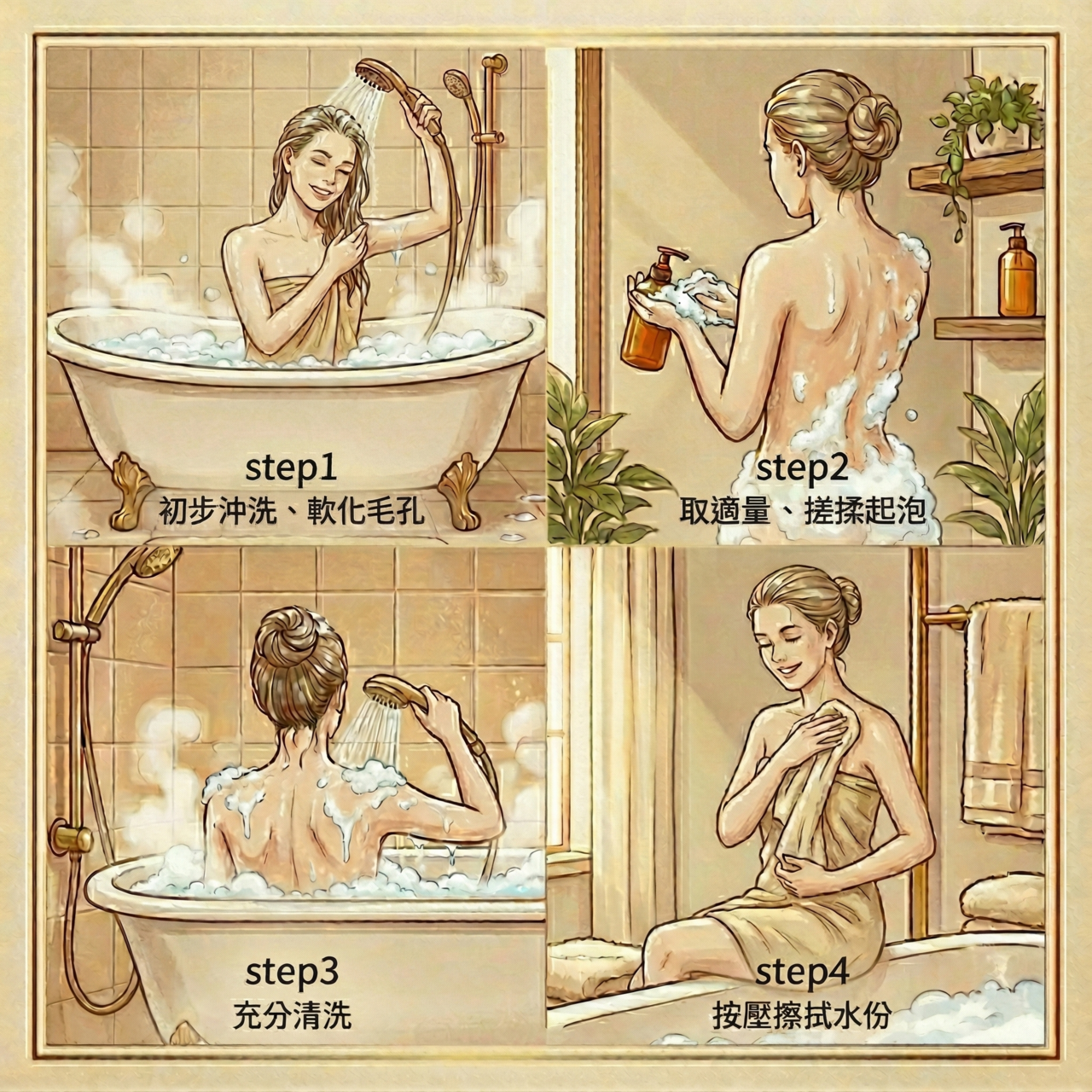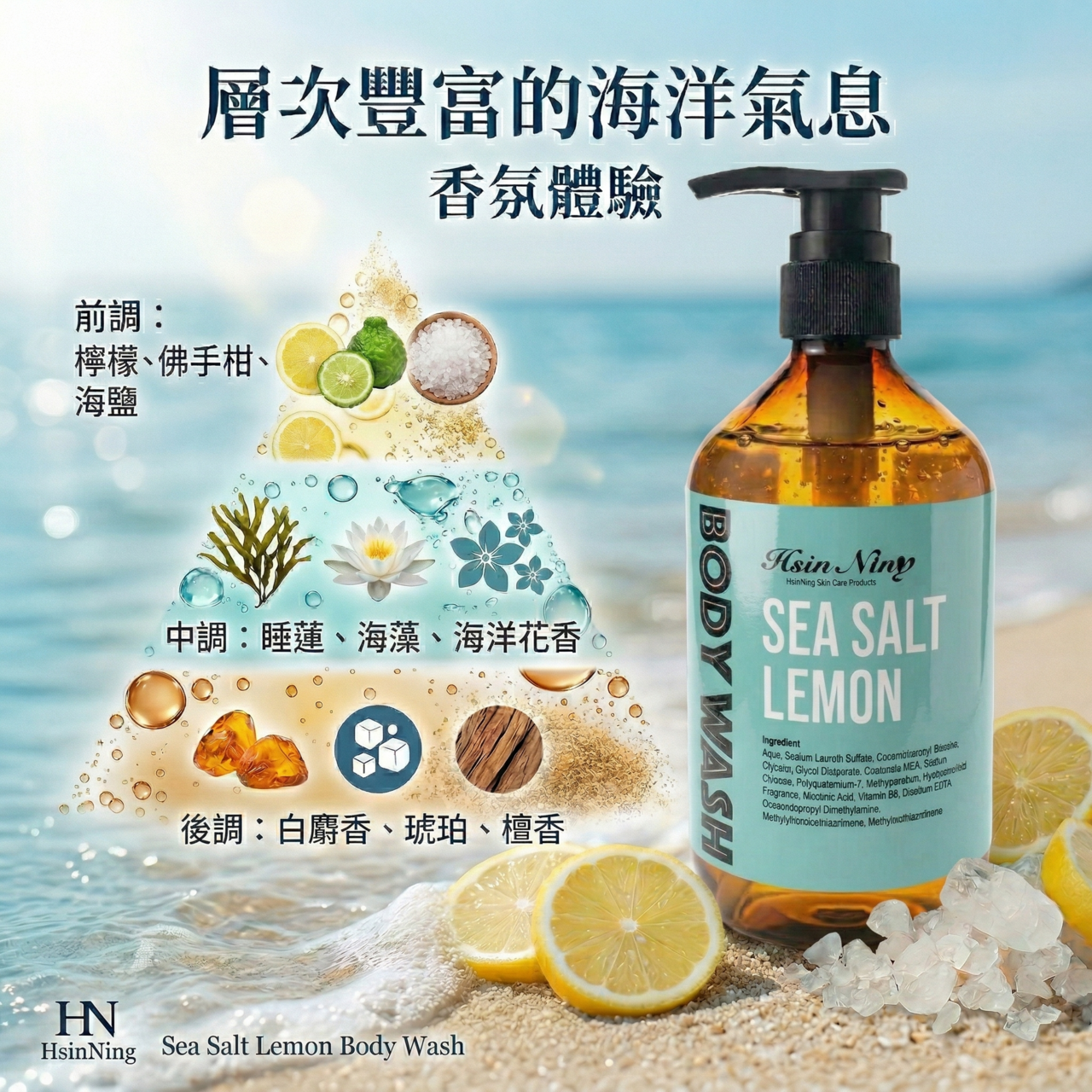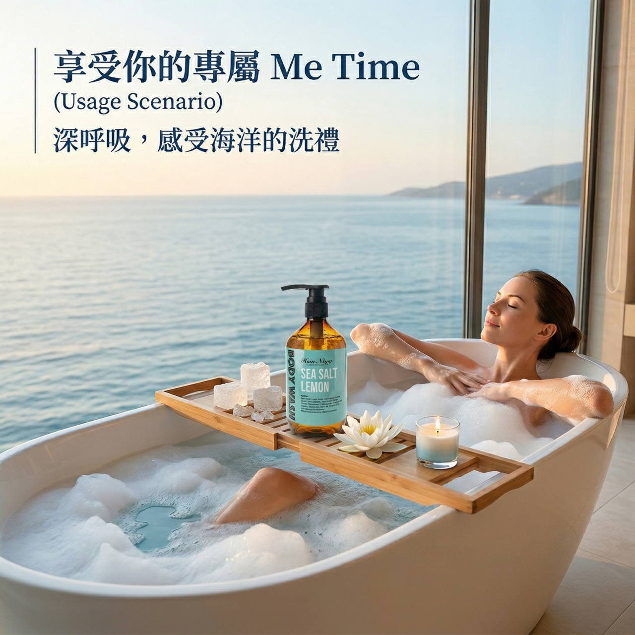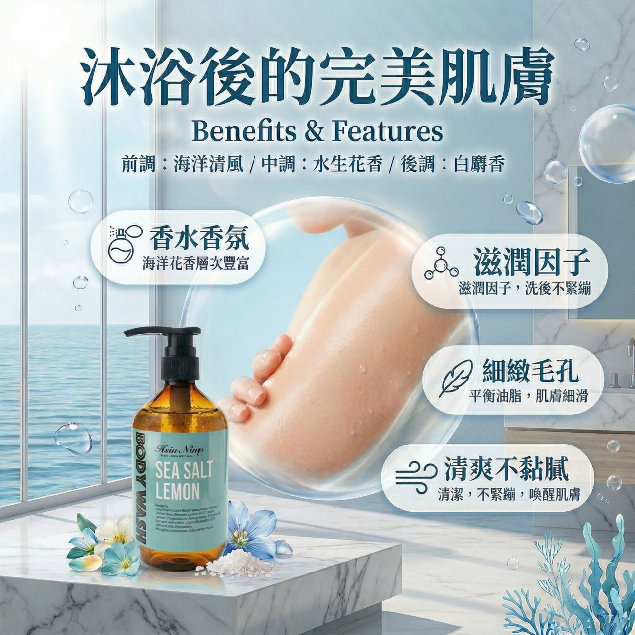 使用小分子玻尿酸+維他命 B3、B6,洗澡同時滋養肌膚,香水等級香氛,安全不刺激。